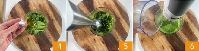 Adicione uma pitada de sal 4 e bata tudo com um mixer de imersão 5, até obter uma mistura bastante líquida. Adicione a farinha 6 e bata novamente até obter uma massa sem grumos.