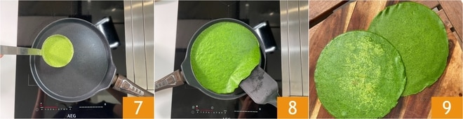 Unte levemente uma crepeira de 24 cm com um pouco de manteiga e aqueça bem no fogo. Despeje um pouco de massa no centro 7 e gire a panela para cobrir toda a superfície. Cozinhe por cerca de 3 minutos, depois, assim que se desprender das bordas, vire a crepe 8 e cozinhe por mais um minuto. Transfira-a para um prato e continue cozinhando as outras, untando a panela com um pouco de manteiga a cada vez. Suas crepes de espinafre estão prontas 9.