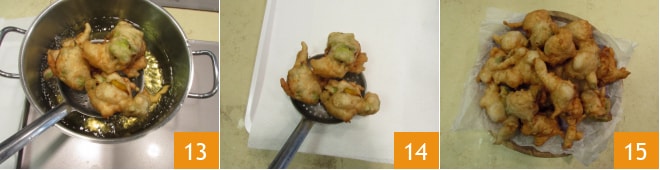 Cubra a tigela com filme plástico 10 e deixe crescer por pelo menos 2 horas, ou até que a massa tenha dobrado de tamanho 11. Passado o tempo, aqueça o óleo de sementes a 170° (meça com um termômetro de cozinha) e então despeje 4-5 colheres de massa no óleo quente e deixe dourar 12.