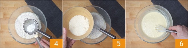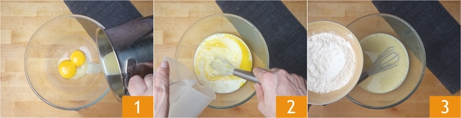 Para preparar as panquecas salgadas, primeiro derreta a manteiga em uma panela em fogo baixo ou no micro-ondas. Enquanto isso, separe as gemas das claras. Na tigela com as gemas, adicione a manteiga morna 1, junte o leite aos poucos e misture 2. Neste ponto, adicione o sal, a pimenta e a farinha 3.