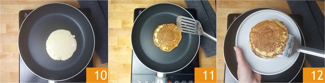 Cozinhe a panqueca de um lado em fogo baixo, até que as primeiras bolhas se formem na superfície 10. Vire a panqueca com uma espátula e termine o cozimento por um minuto do outro lado 11. Proceda desta forma até acabar a massa. As panquecas salgadas estão prontas 12.