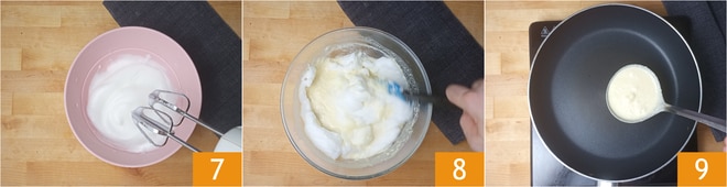 Bata as claras em neve firme com uma batedeira elétrica 7, depois adicione-as à mistura de gemas aos poucos, fazendo um movimento delicado de baixo para cima 8. Unte levemente uma frigideira antiaderente. Despeje uma concha de massa não muito cheia 9.