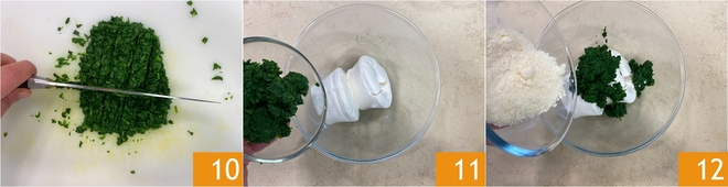 Pique os espinafres com uma faca 10. Em uma tigela, misture a ricota escorrida e os espinafres cozidos 11, depois tempere com o Parmesão ralado 12.