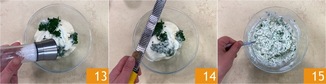 Adicione uma pitada de sal 13 e noz-moscada 14. Misture para incorporar bem 19.