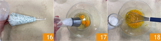 Transfira o recheio para um saco de confeitar sem bico 16 e guarde na geladeira. Passe para a preparação das panquecas sem glúten: em uma tigela, quebre os ovos e adicione uma pitada de sal 17. Despeje o leite 18 e continue mexendo até obter uma massa lisa e fluida.