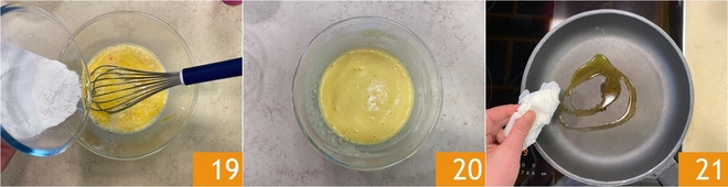 Por fim, adicione a farinha de arroz e mexa com o batedor para eliminar possíveis grumos 19: a massa está pronta 20. Agora cozinhe as panquecas: despeje o óleo em uma frigideira antiaderente, com um diâmetro de 20 cm, e passe um pano de cozinha para remover o excesso e distribuí-lo uniformemente 21.