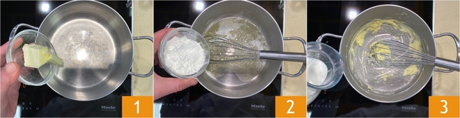 Para preparar as panquecas sem glúten, primeiro dedique-se ao molho bechamel: em uma panelinha, derreta a manteiga em fogo baixo 1, depois acrescente o amido e cozinhe por cerca de 1 ou 2 minutos mexendo com um batedor, para obter um roux 2. Enquanto isso, aqueça o leite 3, em seguida, despeje-o aos poucos na panelinha e mexa energicamente.