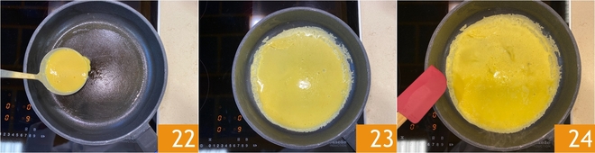 Despeje uma concha de massa no centro 22 e espalhe girando a frigideira ou com o utensílio apropriado para panquecas, até cobrir toda a superfície 23. Cozinhe em fogo médio-baixo por alguns minutos 24.