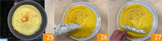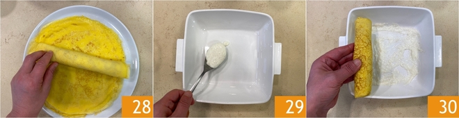 Vire a panqueca com uma espátula e deixe dourar do outro lado por 1-2 minutos 25. Proceda da mesma maneira até terminar a massa e empilhe as panquecas em um prato; com estas quantidades, você obterá 6 panquecas no total. Neste ponto, esprema uma tira de recheio na borda inferior de cada panqueca 26, depois enrole-as delicadamente 27.