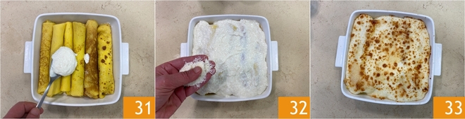 Cubra-as com o restante do molho bechamel 31. Polvilhe a superfície com Parmesão ralado 32. Asse em forno estático pré-aquecido a 200°C por 20-25 minutos, até que a superfície esteja bem dourada e gratinada. Se necessário, você pode colocar em modo grill durante os últimos 5 minutos. Retire do forno e deixe descansar por alguns minutos antes de servir suas panquecas sem glúten 33!