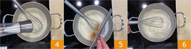 Continue cozinhando até que o molho engrosse, levará cerca de 5 minutos. Por último, tempere com sal 4 e noz-moscada 5, depois deixe esfriar 6.
