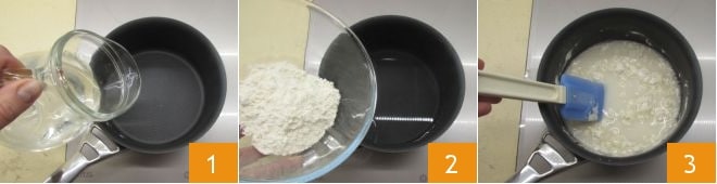 Para realizar o pão brioche com sementes de linhaça, prepare primeiro o water roux: coloque a água em temperatura ambiente em uma panela 1, adicione a farinha peneirada 2 e misture em fogo baixo com uma espátula ou batedor, tendo cuidado para não formar grumos 3.