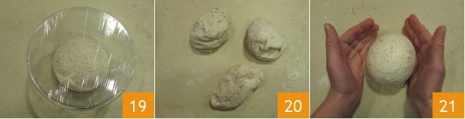 Transfira a bola de massa para uma tigela, cubra com filme plástico 19 e deixe fermentar em temperatura ambiente por cerca de 1 hora e meia. Após o tempo de fermentação, coloque a massa na superfície levemente enfarinhada e divida-a em 3 partes iguais 20. Modele cada porção de massa girando-a entre as mãos para formar uma esfera perfeita e firme 21.