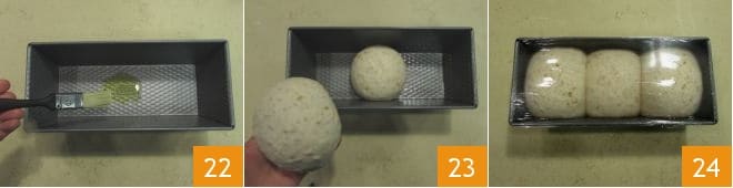 Unte uma forma de pão de forma ou pão caseiro de 26x11 cm 22 e posicione dentro as 3 esferas de massa 23, depois cubra com filme plástico e deixe fermentar a uma temperatura de 26°-27° (por exemplo, no forno desligado com a luz acesa) até que a massa atinja as bordas da forma 24; isso levará pelo menos 1 hora e meia.