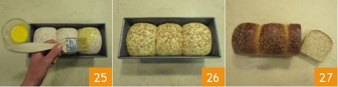 Uma vez fermentado, pincele a superfície da massa com a mistura de leite e gema que você bateu juntos 25, polvilhe com as sementes de linhaça 26 e asse em forno estático pré-aquecido a 190° por cerca de 45 minutos, posicionando-o na prateleira inferior. Para verificar o cozimento, você pode usar um termômetro de cozinha: quando o centro atingir 96°, você pode tirar seu pão brioche do forno e deixá-lo esfriar. Uma vez resfriado, remova o pão brioche com sementes de linhaça da forma e saboreie como preferir 27!