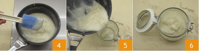 Quando o composto atingir uma consistência gelatinosa com aparência opalescente 4, retire a panela do fogo e transfira o composto para um pote ou recipiente 5, onde você o deixará esfriar 6 fechado com a tampa ou coberto com filme plástico em contato. Uma vez resfriado, o water roux estará pronto para ser usado, então retire uma porção de 150 g que você usará para o restante da receita.