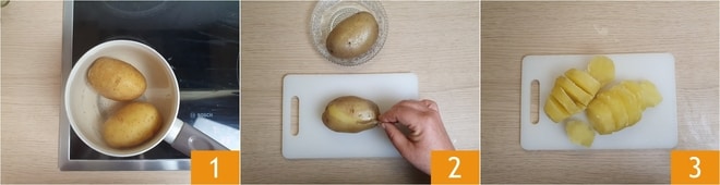 Para preparar o pão brioche macio com batatas, comece pelas batatas. Cozinhe-as em água fervente sem sal por 30-40 minutos, dependendo do tamanho delas 1. Assim que estiverem cozidas, escorra e descasque-as 2, depois corte em fatias 3.