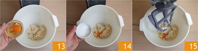 Adicione o ovo 13, o açúcar 14 e ligue novamente a máquina, sempre em baixa velocidade 15, até ser completamente absorvido.