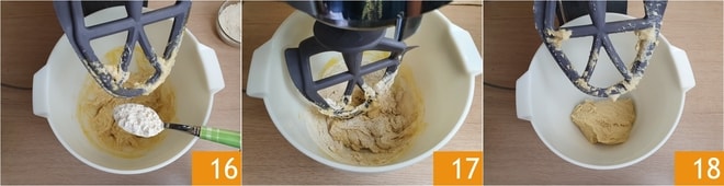 Em seguida, incorpore o restante da farinha (150 g), algumas colheres de cada vez 16. Continuando a amassar 17, você notará que aos poucos a massa começará a tomar forma e se desgrudará das laterais da tigela 18.