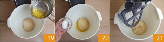Por fim, adicione a manteiga derretida já fria 19 e o sal 20. Agora ligue a máquina em velocidade média e trabalhe a massa 21 até obter uma mistura homogênea.