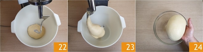 Substitua a folha pelo gancho de amassar 22. Trabalhe a massa por 10 minutos, em velocidade média; ela deve ficar bem ligada e elástica 22. Unte uma tigela grande com um pouco de óleo. Unte levemente suas mãos também, pegue a massa, forme uma bola e coloque-a dentro da tigela 24.