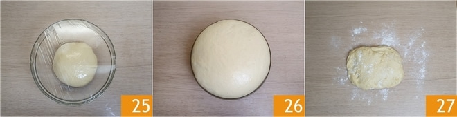 Cubra com filme plástico 25 e deixe crescer no forno desligado com a luz acesa por 2 horas, ou até dobrar de volume 26. Após esse tempo, vire a massa fermentada sobre a superfície de trabalho enfarinhada 27.
