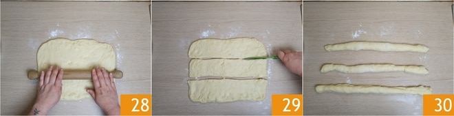 Desinfle com as pontas dos dedos e estenda com um rolo, formando um retângulo de 30x25 cm 28. Com uma faca, corte o retângulo no sentido do comprimento em 3 tiras de mesmo tamanho 29. Enrole cada tira no sentido do comprimento para formar 3 cordões 30.