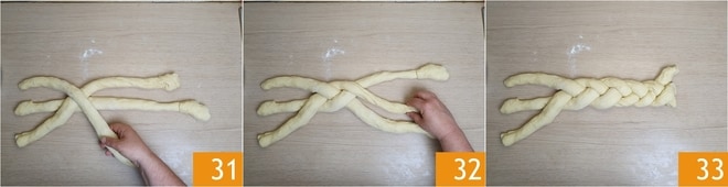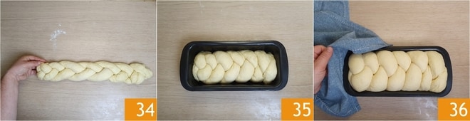 Agora trance também o outro lado 34 para obter uma trança. Unte uma forma de bolo inglês de 26x11 cm e coloque a trança dentro, levantando as extremidades com as mãos. Cubra a forma e a trança com um pano limpo 35 e deixe crescer no forno desligado com a luz acesa por 45 minutos 36.