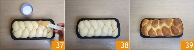 Quando a sua trança estiver inchada e crescida, pincele-a delicadamente com leite usando um pincel de cozinha 37 38. Agora leve para assar. Asse em forno estático pré-aquecido a 180°C por 30 minutos. Para evitar que a superfície queime, durante os últimos 10 minutos, cubra com uma folha de papel alumínio. Quando estiver assado, retire do forno seu pão brioche 19.