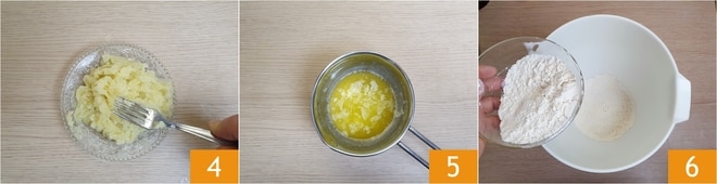 Amasse bem as batatas com um garfo 4 e deixe esfriar completamente. Considere que a quantidade de batatas cozidas a usar na massa será de 150 g. Enquanto isso, derreta a manteiga em uma panela e deixe esfriar 5. Coloque metade da farinha (150 g) na tigela da batedeira 6.