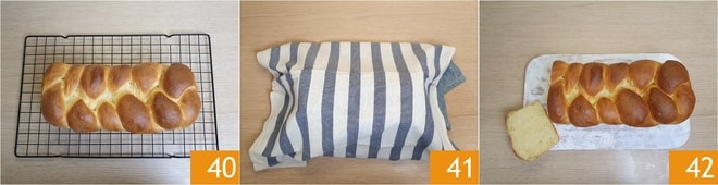 Retire da forma sem se queimar e transfira para uma grade 40. Cubra com 2 panos limpos 41 e deixe esfriar antes de servir seu pão brioche macio com batatas 42.