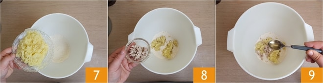 Adicione os 150 g de batatas cozidas 7, o fermento esfarelado 8 e o mel 9.