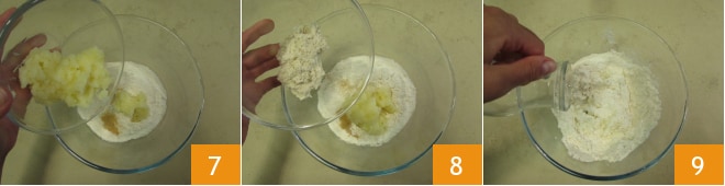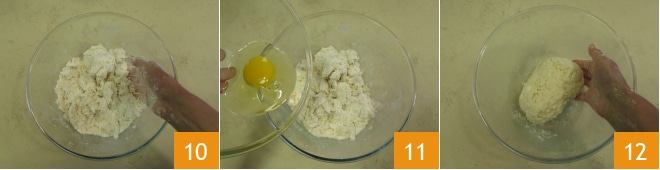 e trabalhe com as mãos por alguns segundos 10. Adicione então também o ovo 11 e trabalhe novamente com as mãos até obter uma massa homogênea e elástica 12.