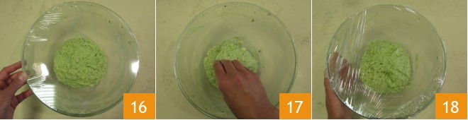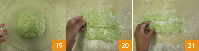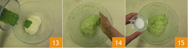 Adicione o molho de rúcula 13 e trabalhe a massa com as mãos por cerca de 5 minutos 14. Adicione então o sal 15 e trabalhe ainda por mais alguns minutos.
