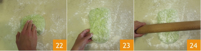 Retome depois a massa 19, transfira-a para uma superfície enfarinhada e alise-a delicadamente com as mãos, formando um retângulo de cerca de 15x10 cm. Neste ponto, leve a borda superior para o centro 20 e a borda inferior por cima dela 21.