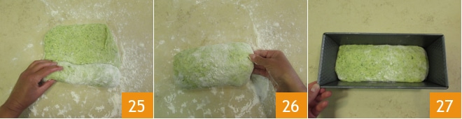 Enrole então o retângulo de massa 25 e sele bem as bordas externas apertando-as com os dedos 26. Transfira para dentro de uma forma de bolo inglês de 22x8 cm previamente untada 27.