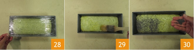Cubra com filme plástico e deixe levedar por 2 horas em temperatura ambiente. Coloque a massa na geladeira e deixe maturar por mais 9 horas. Retire depois da geladeira, retire o filme plástico e deixe em temperatura ambiente por uma hora. Utilizando um pincel, unte a superfície 29 e espalhe as sementes de papoula 30.