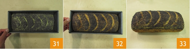Utilizando uma faca afiada, faça incisões decorativas 31. Asse em forno estático pré-aquecido a 180° no meio da prateleira por 40 minutos. Depois retire do forno 32, deixe esfriar antes de desenformar e servir 33.