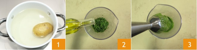 Para preparar o pão brioche com rúcula e batatas, a primeira coisa a fazer é lavar a batata e colocá-la para ferver 1. Isso levará cerca de 30 minutos. Quando espetá-la com os dentes de um garfo e ela estiver macia, escorra e deixe esfriar um pouco. Enquanto isso, prepare o creme de rúcula. Lave-a e escorra bem. Transfira para o recipiente de um mixer, adicione o óleo 2 e bata tudo até obter um creme liso 3