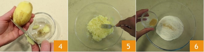 Neste ponto, descasque a batata, transfira-a para uma tigela e amasse-a 5, você obterá 170 g. Em uma tigela grande transfira a farinha e o açúcar mascavo 6.