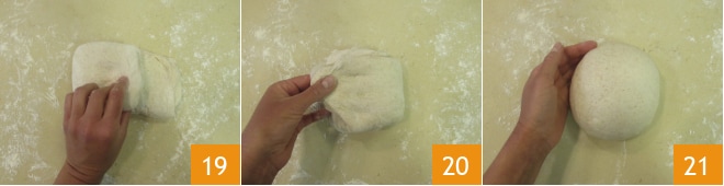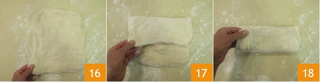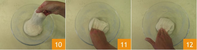 Agora, você deverá fazer 3 voltas de dobras, ou seja, repetir em três momentos as seguintes operações: pegue uma aba externa da massa, levante-a 10 e leve-a ao centro 11. Gire a tigela, pegue outra aba de massa e leve-a ao centro 12. Gire novamente a tigela, pegue outra aba da massa e leve-a ao centro. Pela última vez, gire novamente a tigela, pegue outra aba da massa e leve-a ao centro, para um total de 4 dobras ou sobreposições. Cubra com filme plástico e deixe descansar por cerca de 15 minutos. Repita essas operações como indicado por mais duas vezes, com um intervalo de tempo de 15 minutos entre uma e outra. Assim, você terá feito suas 3 voltas de dobras.