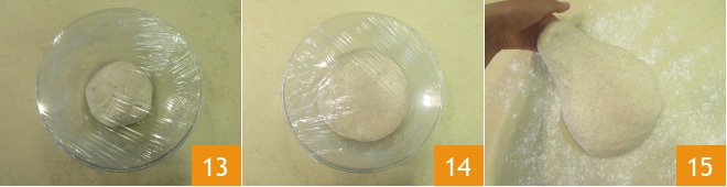 Após a terceira volta, cubra com filme plástico 13 e deixe descansar por cerca de 4 horas em temperatura ambiente. Depois, transfira para a geladeira e deixe maturar por 12 horas. Retome a massa, que estará levemente fermentada 14, transfira-a para uma superfície bem enfarinhada (sempre com farinha tipo 1). Abra delicadamente a massa com as mãos 15, levantando-a por baixo.