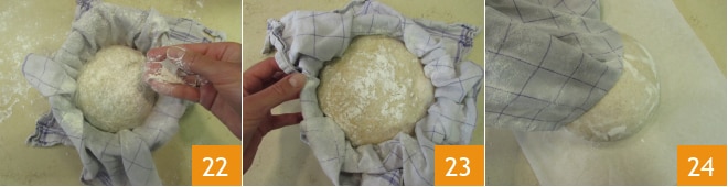 Forre uma forma para pão (ou uma tigela) com um pano de cozinha seco e limpo e enfarinhe-o levemente. Transfira a massa formada com a junção para cima. Enfarinhe levemente com farinha tipo 1 22 e cubra com as abas do pano. Deixe a massa descansar por 2 horas em temperatura ambiente e transfira novamente para a geladeira por 6 horas. Nesse ponto, acenda o forno a 250° estático, deixando uma panela de ferro fundido dentro do forno até atingir a temperatura (alternativamente, você pode usar a assadeira do forno para assar o pão). Quando o forno estiver quente, pegue a massa 23 e vire-a sobre uma folha de papel manteiga 24.