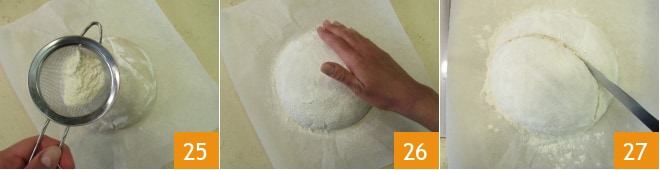 Peneire levemente a superfície do pão sempre com farinha tipo 1 25, espalhe-a delicadamente com as mãos 26 e faça um corte oblíquo de lado a lado 27.
