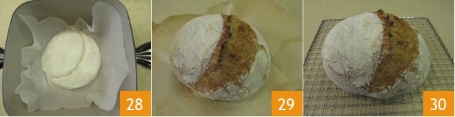 Transfira para dentro da panela ou da assadeira quente sem se queimar 28 e asse em forno estático por cerca de 30 minutos a 250° e por mais 5 minutos em forno ventilado, ainda a 250°. Quando estiver pronto, retire o pão do forno 29, transfira-o para uma grade 30 e deixe esfriar completamente antes de cortá-lo (pode levar uma hora).