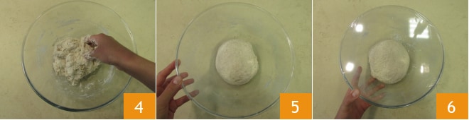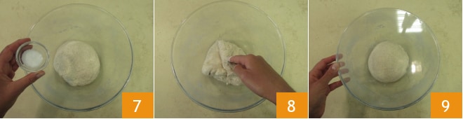 Agora retire o filme plástico, adicione o sal 7 e trabalhe a massa, trazendo a massa de fora para dentro com movimentos fluidos, girando também a tigela 8. Repita essa operação por cerca de 5 minutos. Cubra novamente com o filme plástico 9 e deixe descansar por cerca de 30 minutos.