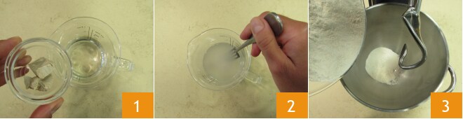 Para preparar o pão de forma, comece pela massa. Despeje o fermento biológico fresco na água em temperatura ambiente 1 e mexa para dissolvê-lo completamente 2. Em uma batedeira equipada com gancho, coloque a farinha 3