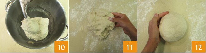 Continue a trabalhar até que a massa se desprenda completamente das bordas da tigela e esteja bem presa ao gancho 10. Despeje a massa obtida sobre uma superfície de trabalho levemente enfarinhada 11 e trabalhe-a rapidamente para dar a forma de uma bola 12,