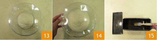 depois transfira-a para uma tigela, cubra com filme plástico 13 e deixe crescer em temperatura ambiente por cerca de 1 hora e meia. Após o tempo de crescimento 14, unte bem uma forma para pão de forma de 25x10x10 cm e sua tampa 15.