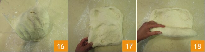 Despeje a massa fermentada sobre a superfície de trabalho levemente enfarinhada 16, abra-a com as mãos para obter um retângulo de 25 cm de largura 17 e depois enrole-a sobre si mesma, esticando a massa 18.
